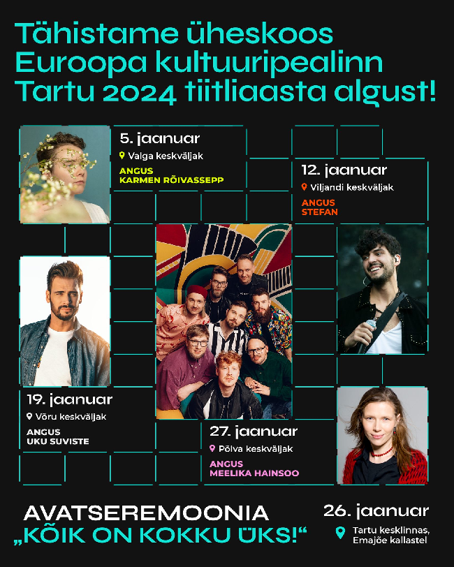 Tartus toimuvale ametlikule Euroopa kultuuripealinna avamisele eelnevad ja järgnevad avamised Lõuna-Eestis: Valgas (05.01), Viljandis (12.01), Võrus (19.01) ja Põlvas (27.01). Maakondlikel kultuuripealinna avamistel astub üles Lõuna-Eesti reggae-bänd Angus koos kultuuripealinna piirkondadest pärit artistidega: Stefan, Uku Suviste, Karmen Rõivassepp ja Meelika Hainsoo.