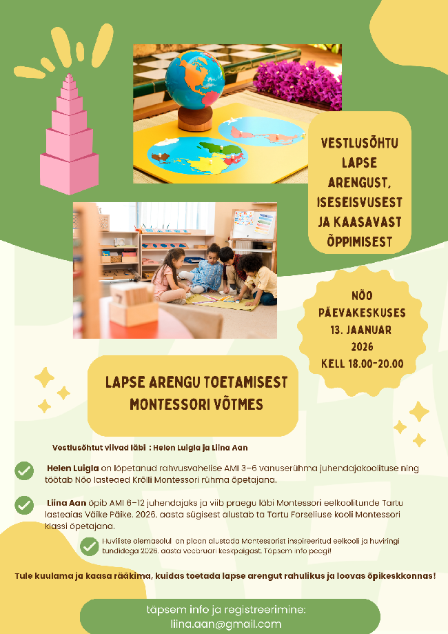 Igas lapses on peidus uudishimu ja soov maailma avastada. Montessori pedagoogika lähtub lihtsast tõest: laps õpib kõige paremini siis, kui ta saab ise proovida, uurida ja katsetada. Meie,...